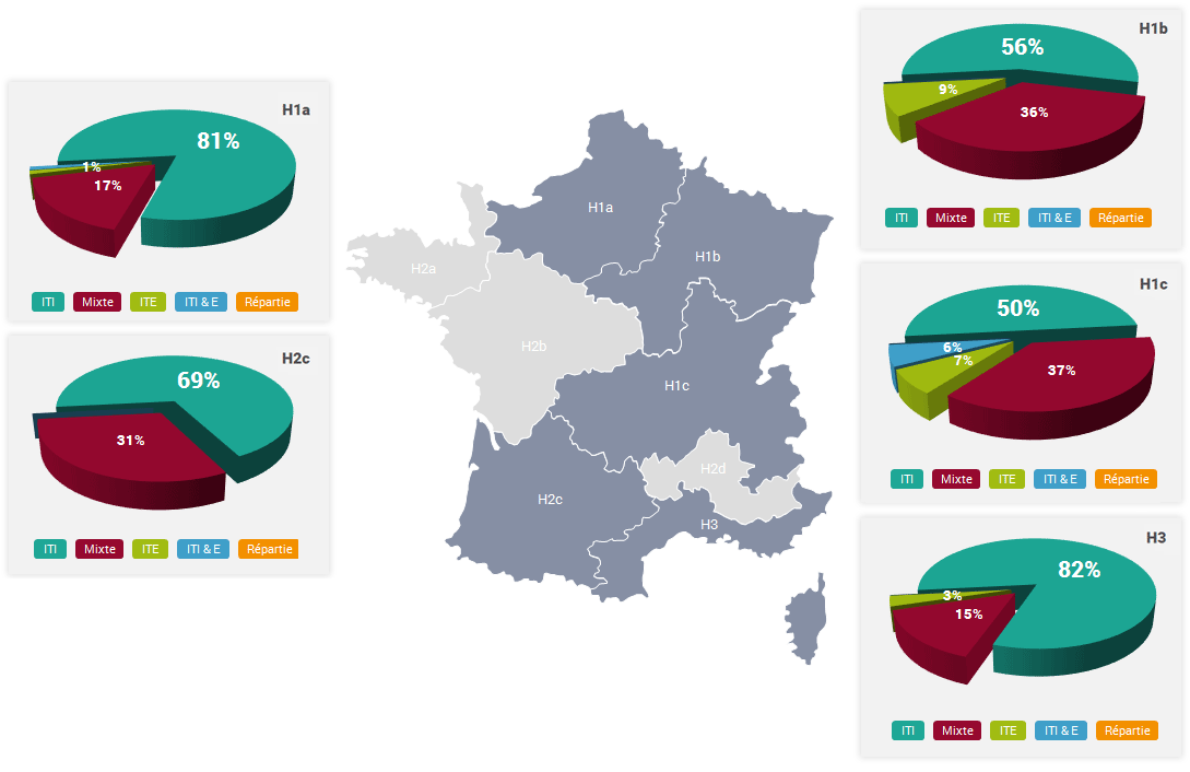 - Dans les zones H1b et H1c, à l’Est, l’ITI (Isolation par l’intérieur sur tous les murs extérieurs) est nettement moins utilisées que dans les autres zones, au profit de l’ITE (Isolation par l’extérieur sur tous les murs extérieurs) et des bâtiments avec plusieurs types d’isolation. Cela s’explique par la recherche de performance plus accentuée dans ces régions au climat plus froid.