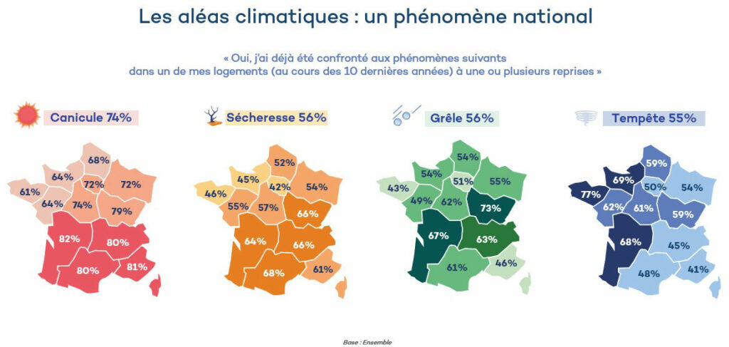 86 % des Français disent avoir été confrontés au moins une fois à un aléa climatique dans un de leurs logements, avec ou sans dégât matériel. Ils citent essentiellement : la canicule (74 %), la sécheresse ou la grêle (56 %), la tempête (55 %), la vague de froid (48 %) ou l’inondation pluviale ou fluviale (33 %). A noter, le phénomène de retrait-gonflement des argiles est mentionné par seulement 12 % des sondés, alors même qu’il s’agit également d’un phénomène prégnant, touchant potentiellement plus de 10 millions de maisons.