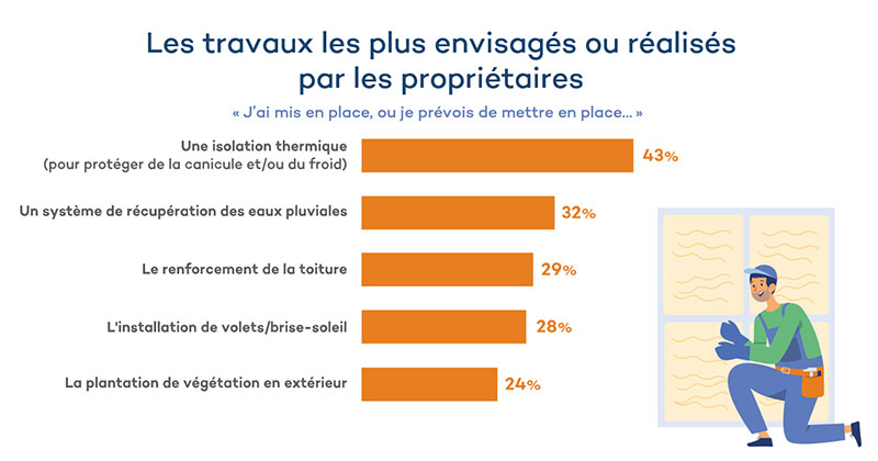 In fine, malgré une conscience significative du risque, peu de propriétaires anticipent des travaux pour se prémunir des dégâts qui pourraient être générés par des aléas climatiques : 20 % seulement y ont pensé, dont seulement 13 % l’ont fait. Un chiffre qui monte à 21 % pour ceux ayant déjà subi des dégâts de ce type.