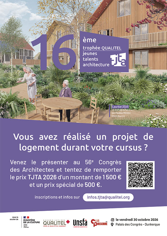 En partenariat avec l’Union Nationale des Syndicats Français d’Architectes (UNSFA) et le Club Prescrire, et avec le soutien du ministère de la Culture, le 16ème Trophée QUALITEL Jeunes Talents Architecture sera remis lors du 56ème Congrès des Architectes le vendredi 30 octobre 2026 à Dunkerque.