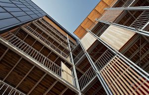 - Matériaux utilisés : ossature bois et béton, zinc et aluminium pour les vitrines des commerces